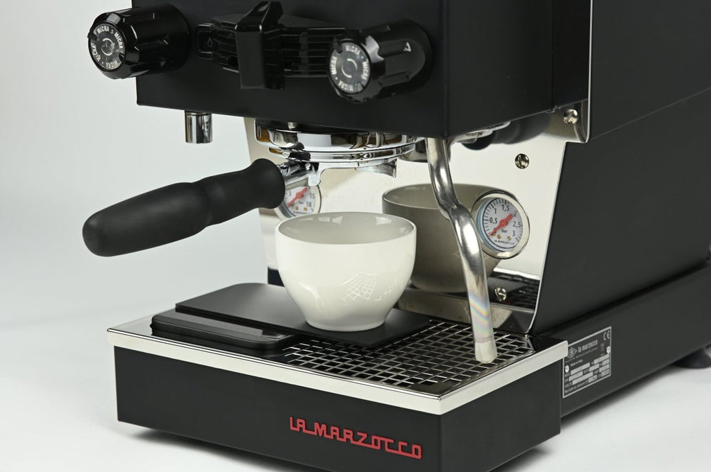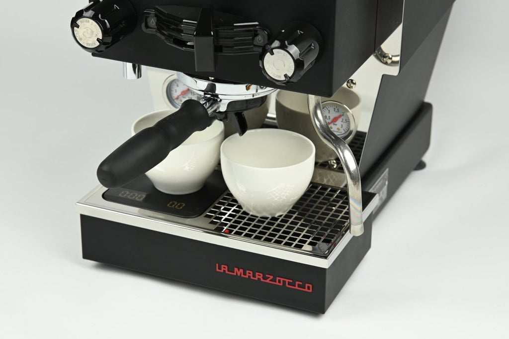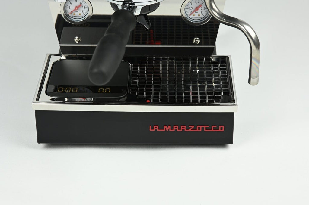 Due to the setup of the Linea Micra’s drain tray, the scale is positioned on the left side of the new drip tray – easy to use with the single or double spouts. In case you want to pull bottomless shots, a custom weighing plate has been developed, lightly magnetized for a perfect fit and made from high-quality, anodized aluminum. This allows you to place a cup in the center of the machine while keeping your Acaia Lunar as precise as before (variance compared to the center of the scale <0.2g).