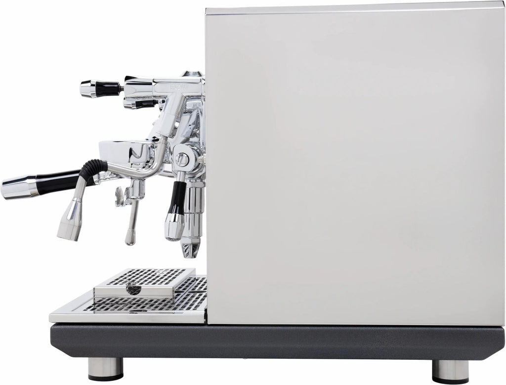 Features 70° angled professional-grade steam and hot water valves, paired with weight-balanced portafilters for improved handling and comfort